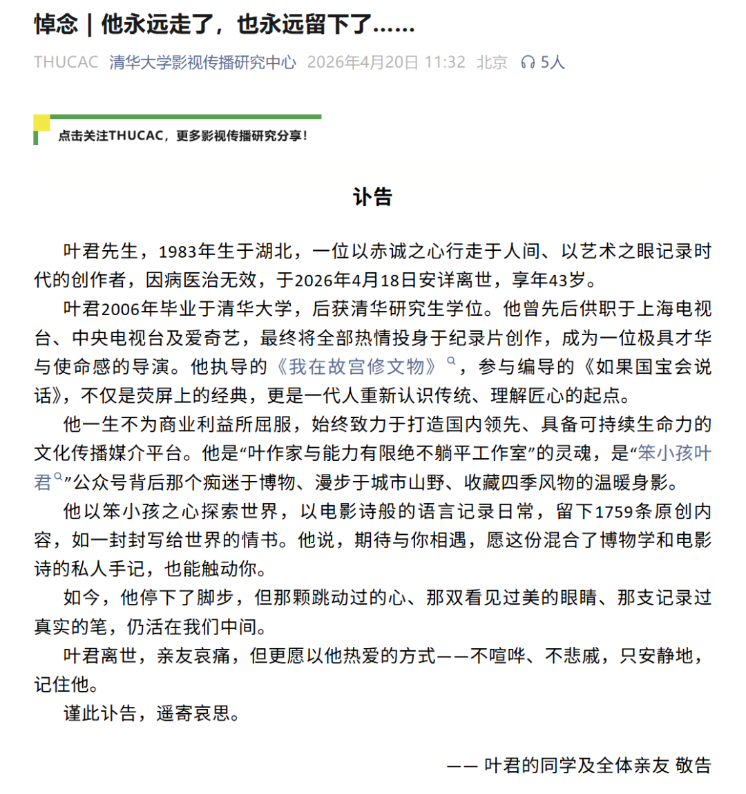 4月20日,多位博主在社交平台发文悼念《我在故宫修文物》导演叶君。