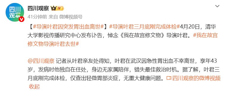 据四川观察,记者从叶君亲友处得知,叶君在武汉因急性胃出血不幸离世,享年43岁,发病时他独自在住处,身边无家属陪伴,错失最佳救治时机。据了解,叶君三月底刚完成体检,仅查出轻微胃部炎症,无重大健康问题。